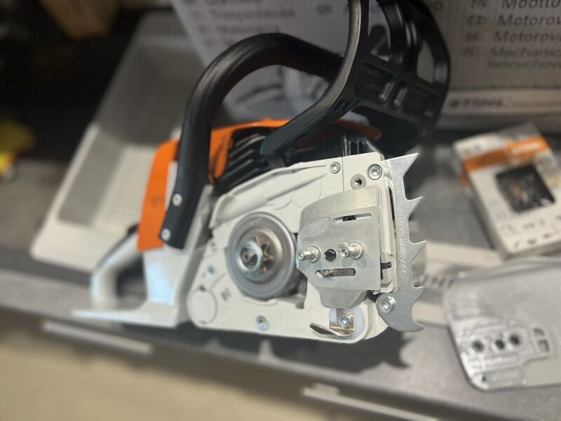 Die Motorsäge ist mit einem Antivibrationssystem, einem seitlichen Kettenspanner, einem Dekompressionsventil, einem STIHL ElastoStart-Startgriff, einem Kompensator und einer Ölpumpe mit Ölmengenregulierung ausgestattet.